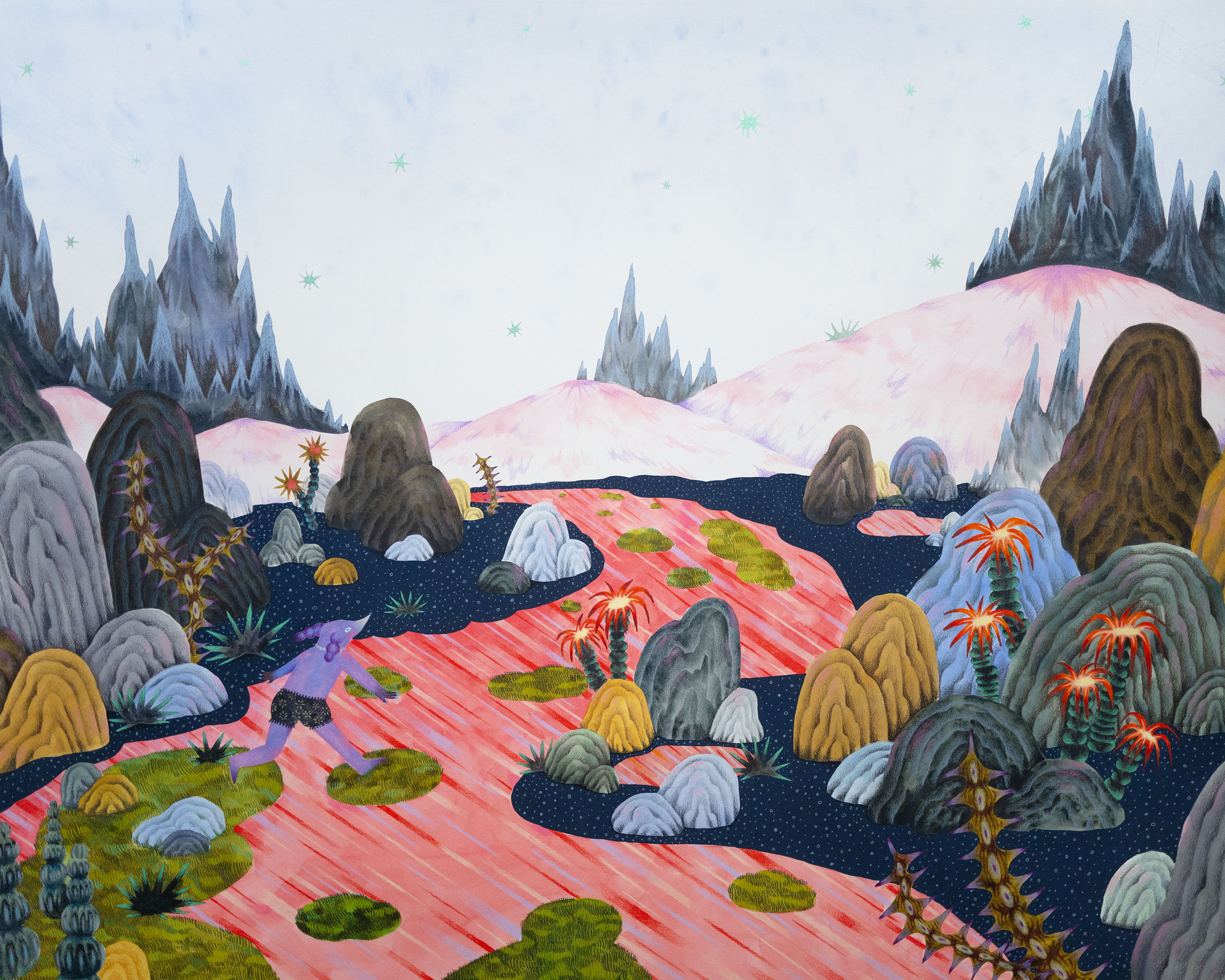 Each painting portrays a different stage or perspective of this ongoing journey. The world Duairak creates is inspired by various landscapes she has encountered—many featuring desert terrains and organic forms. Through her imaginative characters, Duairak expresses the search for meaning and direction within these surreal environments.